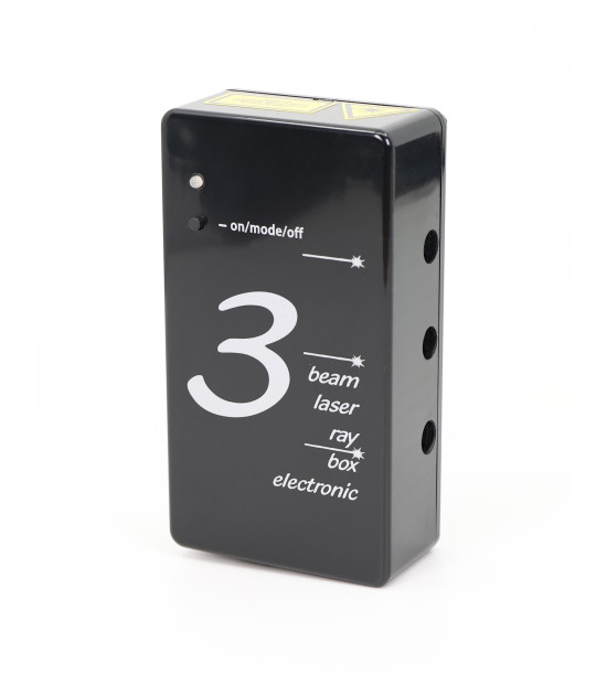 The 3-Beam Laser Ray Box Electronic consists of 3 independent red laser modules producing 3 parallel lines that are collimated by cylindrical lenses to be highly visible. The on/mode/off switch provides the following light source modes in the option: