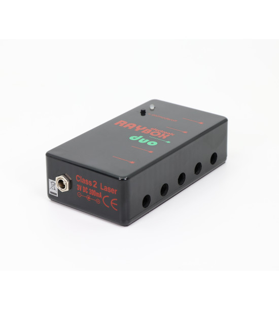 The Duo Laser Ray Box - Electronic consists of five independent red laser modules producing five parallel lines that are collimated by cylindrical lenses to be highly visible. It is packed with the same features as the Laser Ray Box, but adds electronic shade control in the form of an on/mode/off switch, where the following light source modes are an option: