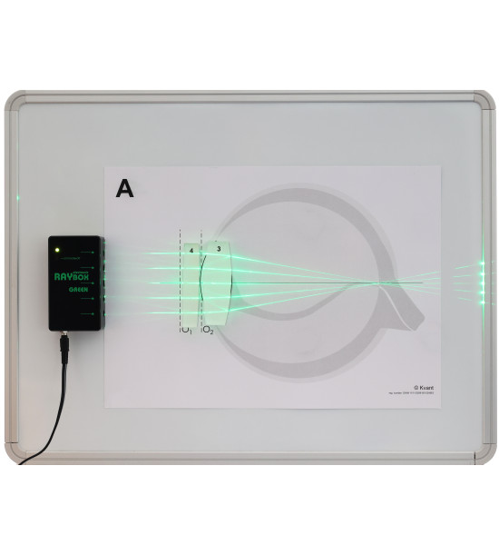 The Green Laser Ray Box Electronic is a complementary product for the Ray Optics Demonstration Set. It is taped with magnetic foil, allowing intuitive attachment to a magnetic board or use in conjunction with sheets and models from the Ray Optics Demonstration Set.