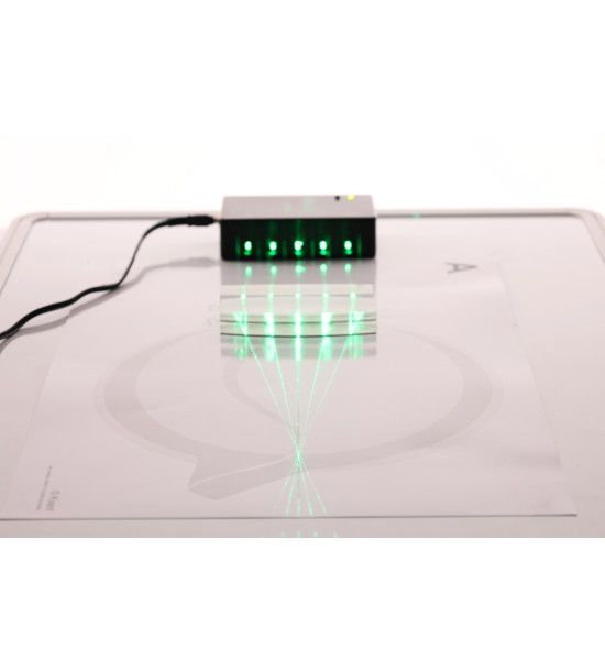 The laser is very effective in the demonstration of light traces. Especially thanks to its green laser modules. The human eye is 3 times more sensitive to green light than red light which makes this version of Ray Box a very interesting choice. It also effectively demonstrates the transmission of rays through a combination of optical elements. Five clearly visible parallel line rays can be seen easily due to collimation by cylindrical lenses.
