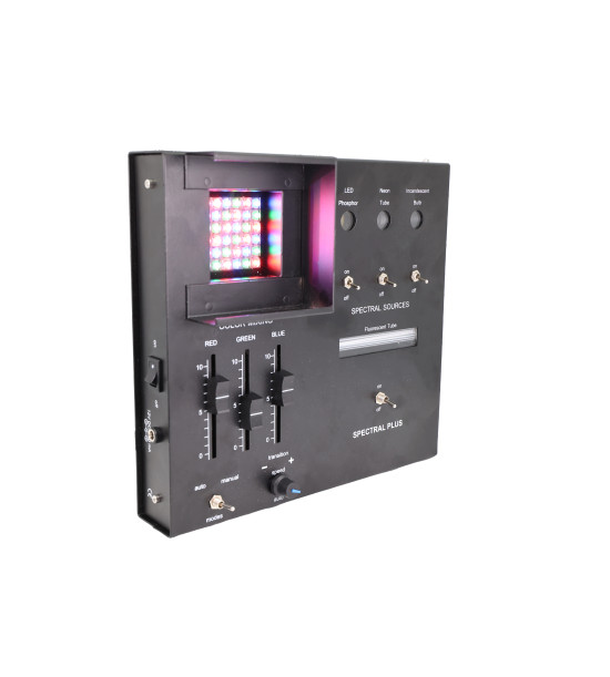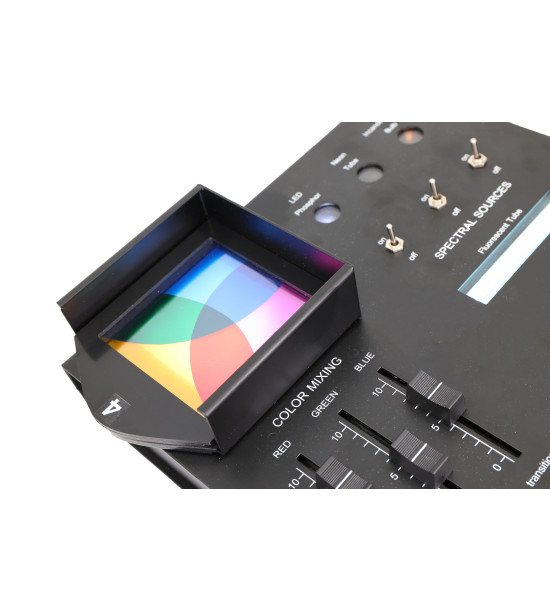 The Spectral Plus demonstration set is designed for easy visualization of the basic light and colour principles. By using red, green and blue light-emitting diodes (LEDs), filters of different colours and gratings, it is possible to demonstrate additive and subtractive colour mixing, light diffusion, absorption and diffraction. By using the spectroscope students can analyze the light emitted by the different light sources, understand the difference between continuous and bright line spectra and understand the general white light source.