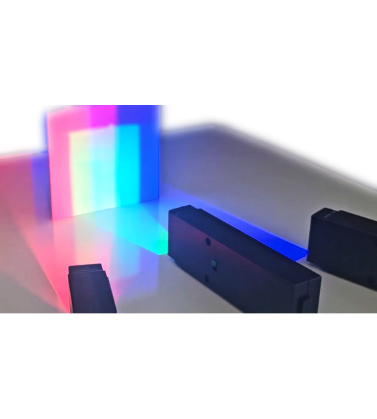 The LEDs without the attachment produce a wide, expanding beam, enabling clear demonstrations of color mixing. By directing the colored beams onto a surface students can observe additive color blending. The set also works exceptionally well for shadow-based color experiments, where illuminating a small object with all three beams creates colorful and visually engaging shadow patterns.