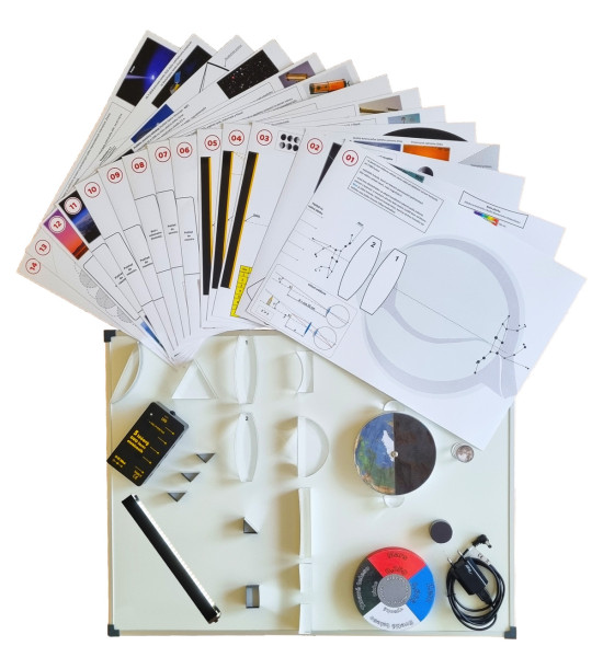 All topics and tasks can be conducted by a lecturer of the class in the field of astronomy, physics, optics, mathematics, geometry, etc. Some optical elements from the set (lens, scattering, semicircle, mirrors) can be used to explain and represent other optical phenomena (refraction of light, light reflection, etc.). Every element is taped with magnetized foil at the bottom, allowing intuitive attachment to a magnetic board.