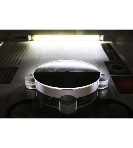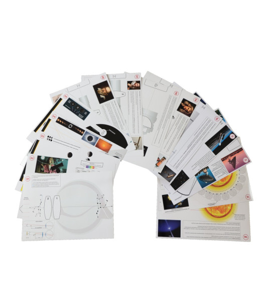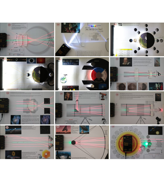 The Astro Laser Set uses two different independent sources of light (white LED, red and green laser light), which represent the Sun or the stars and are visible even in normal daylight or under artificial lighting in the interior. The kit contains plastic elements that present cosmic bodies (Earth, Moon, exoplanet ...) and optical elements (lenses, mirrors, etc.). The working drawings have exactly marked positions where optical elements, light sources and other objects are supposed to be placed during each task.